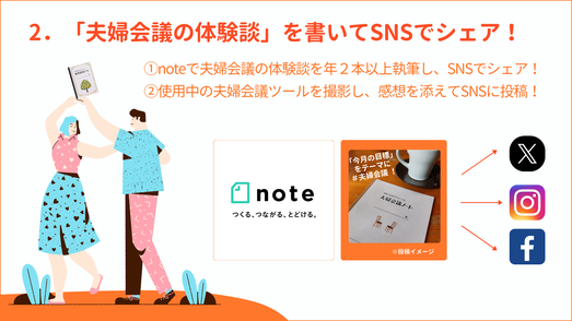①約1年間の活動期間中にnoteで2本以上「夫婦会議の体験談」を執筆し、SNSでシェアしてください。