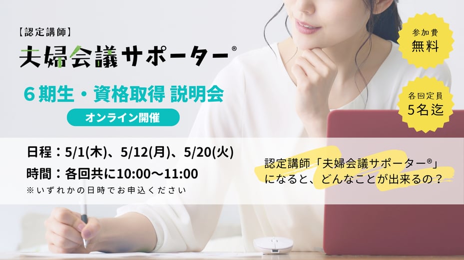 ※認定講師「夫婦会議サポーター®︎」6期生の養成講座エントリーに際して、資格取得説明会への参加は必須ではありません。