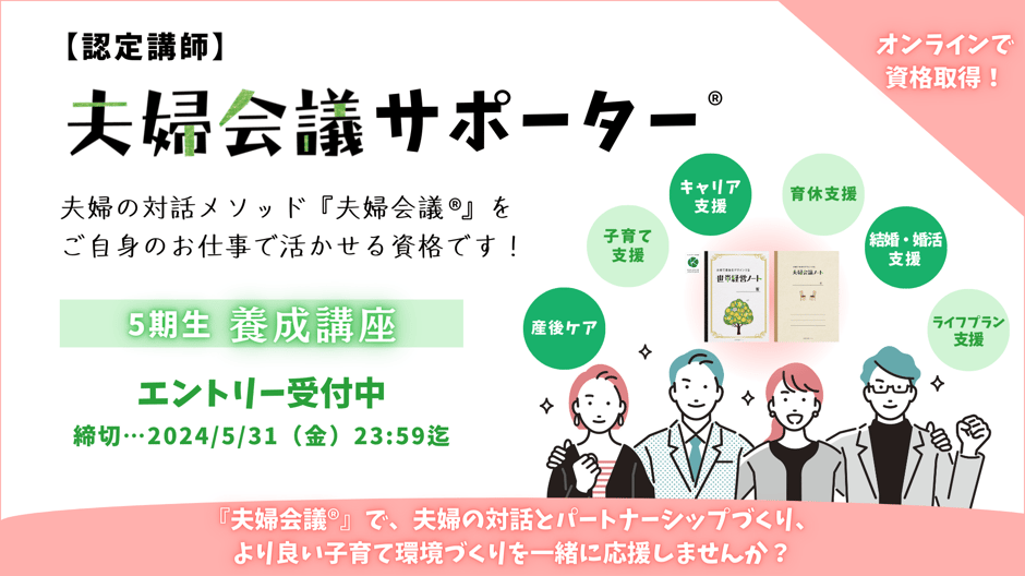 ※認定講師「夫婦会議サポーター®︎」5期生の養成講座エントリーに際して、資格取得説明会への参加は必須ではありません。