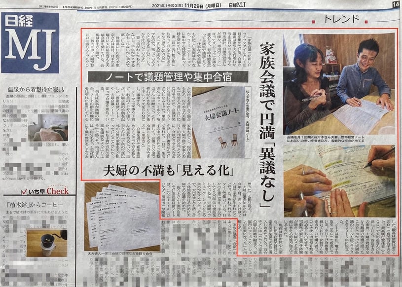 夫婦会議アンバサダーさんの体験談と共に『夫婦会議』について取材いただいた内容が、2021年11月29日(月)の日経MJで掲載されました。